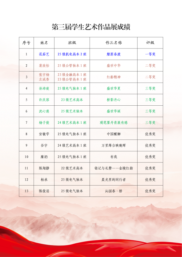本次艺术作品展历时2个月,围绕抗战精神传承、礼赞祖国等主题,动员学生以绘画、书法、诗歌、短视频等形式进行文艺作品创作。为保障评选的专业性与公正性,学院特邀专业教师组成评审团队,从思想内涵、艺术表现力等多维度进行严格评审,最终13份作品脱颖而出,获奖名单如下。